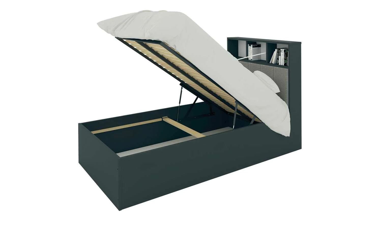 - Lieferumfang / mitgeliefertes Zubehör: Lattenrost , gepolstertes Kopfteil mit Regal, Lampe