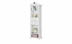 Einen romantisch verspielten Look hat das Bücherregal Fairytale. Es ist komplett in Weiß gehalten und hast eine verschnörkelte Formgebung, die an den Landhausstil erinnert. Am Kranz ist mittig eine dekorative Rose angebracht. Das Rosenmotiv findet sich auch auf den Keramikgriffen wieder. Neben vier offenen Fächern verfügt Fairytale über vier kleine Schubladen.