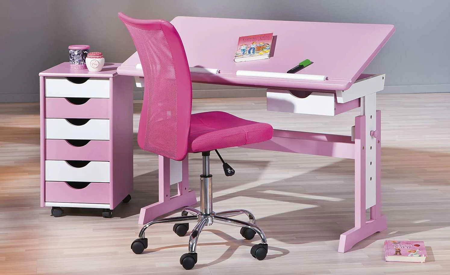 Mit diesem Drehstuhl sitzt Ihr Nachwuchs beim Erledigen der Hausaufgaben komfortabel. Der moderne Drehstuhl besitzt eine luftdurchlässige, leicht gebogene Rückenlehne, welche den Rücken stützt. Die gepolsterte Sitzfläche ist von 44 auf 54 Zentimeter höhenverstellbar und sowohl für frisch eingeschulte Kinder und ältere Schulkinder geeignet. Dank der leichtgängigen Universalrollen ist der Drehstuhl auch auf Teppichböden mobil.
