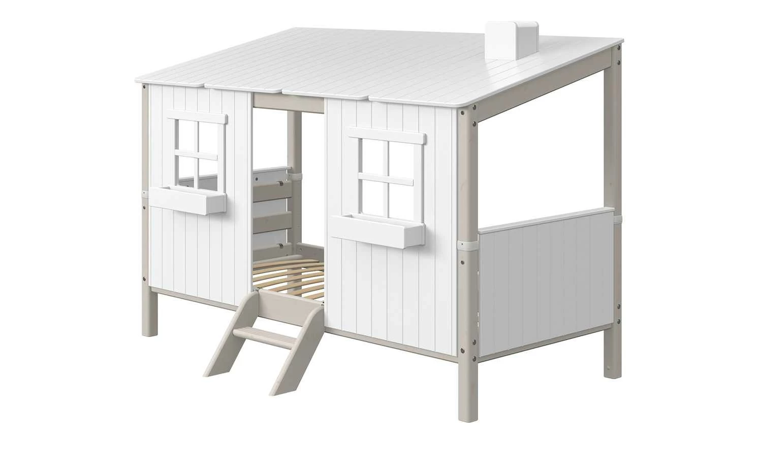 Ein Haus mitten im Kinderzimmer? Das geht mit dem Bettgestell Flexa Classic Haus von der Marke FLEXA. Das Bettgestell hat ein liebevoll gestaltetes Hausdesign mit ganz vielen Details. Dazu gehören Dach mit Schornstein, ein Eingang mit Leider und Fenster. Letzter haben einen kleinen Blumenkasten der hübsch dekoriert werden kann. Wie alle Artikel der Marke FLEXA, ist auch das Haus aus besten Materialien – wie massiver Kiefer – gefertigt. Deshalb ist es mit diversen Gütesiegeln ausgezeichnet. Praktisch: Der passende Lattenrost ist im Lieferumfang enthalten. Eine Matratze in 90 x 200 cm Größe ist separat erhältlich.