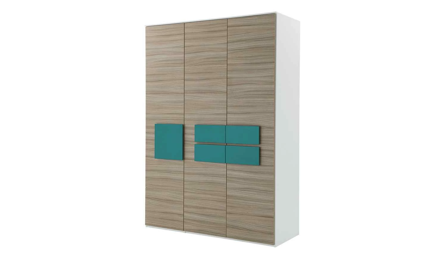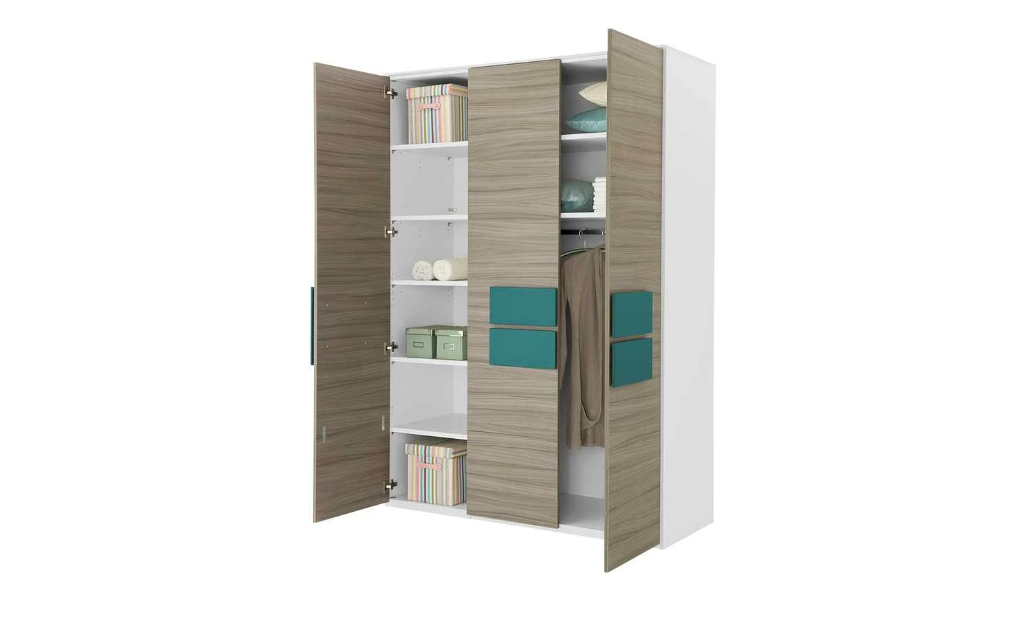 Für Ordnung im Kinder- und Jugendzimmer sorgt der Kleiderschrank Holly. Er ist mit drei Türen ausgestattet – und viel Stauraum dahinter. Der Schrank hat sechs kleinere und zwei große Fächer. Die Kleiderstange können Sie zum Aufhängen von Kleidung nutzen. Neben seiner Praktikabilität, ist der Schrank auch optisch attraktiv. Die quadratischen und rechteckigen Frontabsetzungen in Kontrastfarbe setzen Akzente. Genial: Gleichzeitig dienen sie als Griffe.