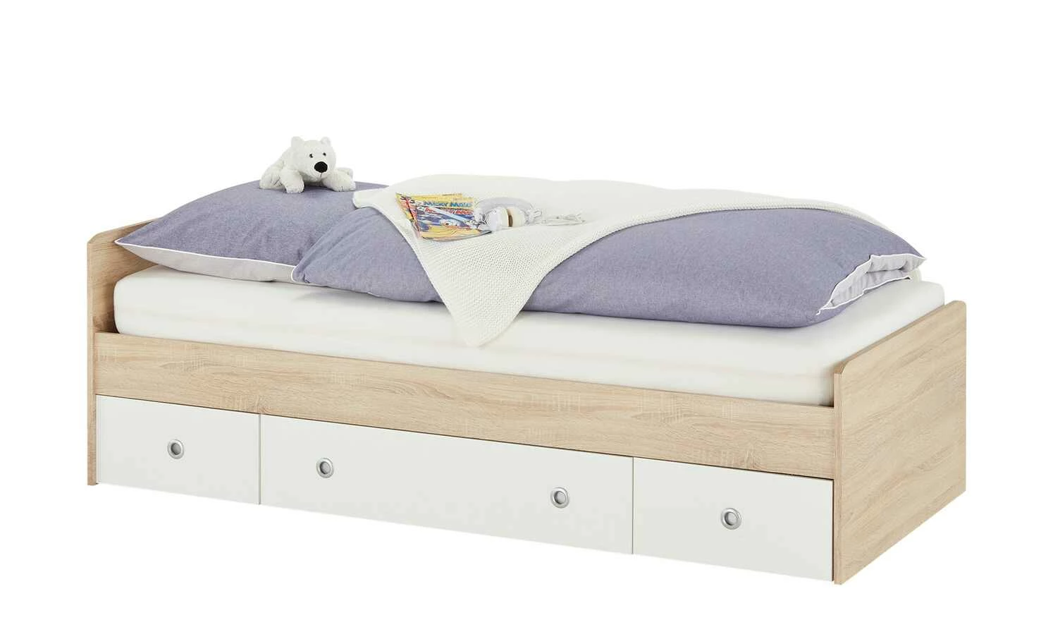 Das Kojenbett Wiki bietet Stauraum unter der Liegefläche. Gleich drei Schubladen können Sie viel Spielzeug oder andere Dinge nutzen. Die Schübe sind weiß. Sie setzen sich schön vom Bettgestell in Eiche Sonoma (Nachbildung) ab.