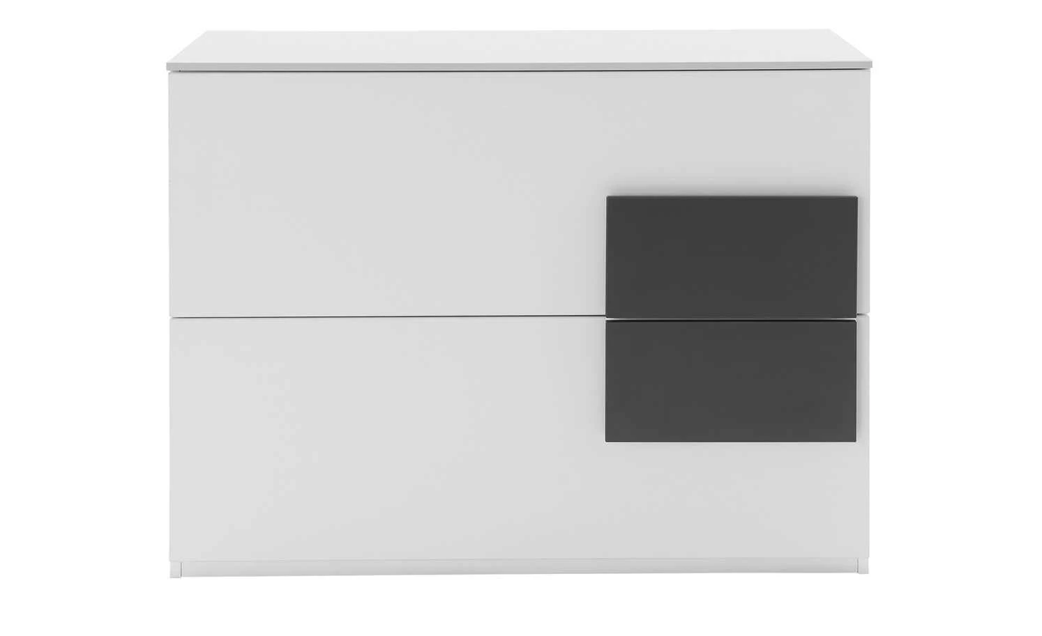 Die Kommode Holly ist mit zwei großen Schubkästen ausgestattet. Diese erstrecken sich über die gesamte Breite der Kommode und sind übereinander angeordnet. Die rechteckigen Griffe sind seitlich befestigt und setzen sich farblich ab. Die beiden Griff-Rechtecke ergeben ein Quadrat. Korpus und Front sind dank der Melaminbeschichtung strapazierfähig und pflegeleicht.