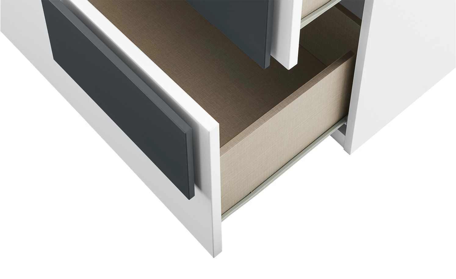 - Mehr zur Ausführung: Türen mit farbig abgesetzten Griffapplikationen, Schubkastenzargen in Textilstruktur Grau