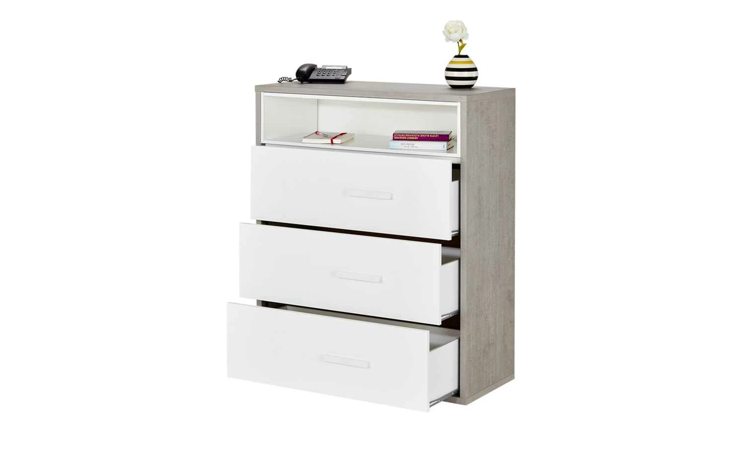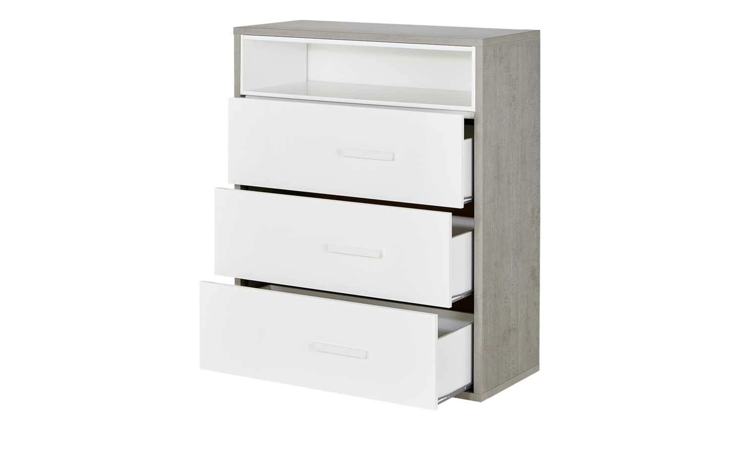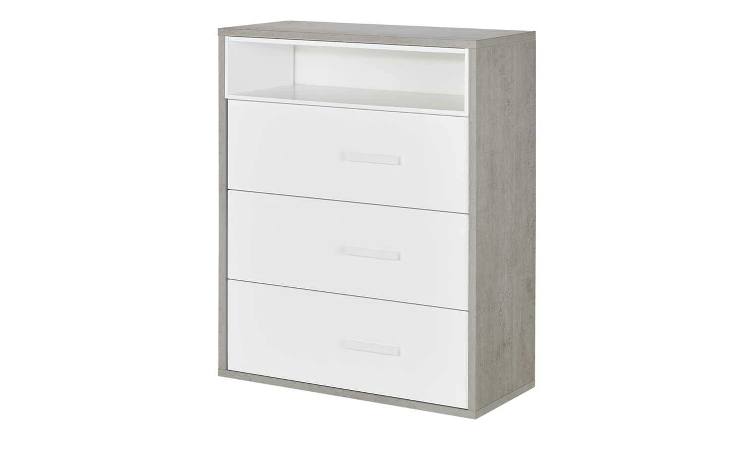 Die Kommode Milow ist praktisch für das Jugendzimmer. Sie verfügt über drei Schubladen und ein offenes Fach. Die Front fällt durch ihren Hochglanz in Weiß auf. Ein interessantes Detail sind die etwas seitlich angebrachten weißen Griffe. Der Korpus steht im Kontrast zur Front. Er hat eine auffällige Betonfarbe. Die Kommode können Sie mit den anderen Möbeln der Serie ergänzen.