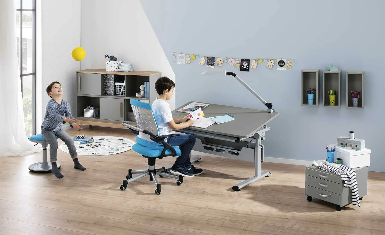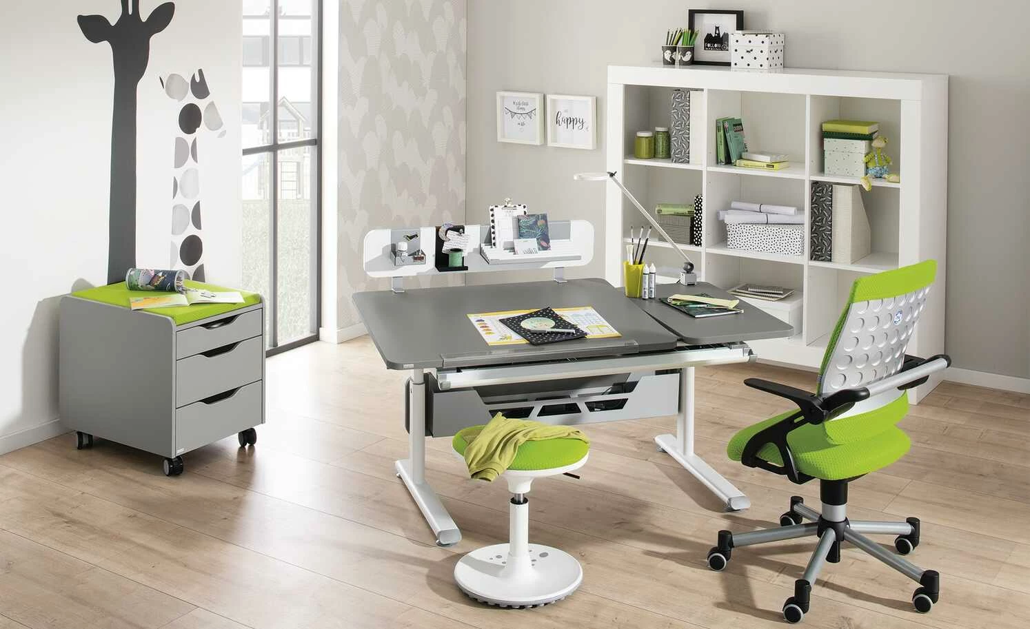 - Mehr zu Ausstattung / Funktion: Streifenbürste zwischen den Tischplatten als Klemmschutz, Schreibtischplatte geteilt, große Platte schrägstellbar bis 19°, kleine feststehende Tischplatte links oder rechts montierbar, mit Lineal 60 cm in grau, Ablageschale und Taschenhaken
