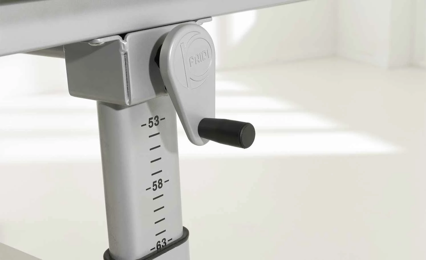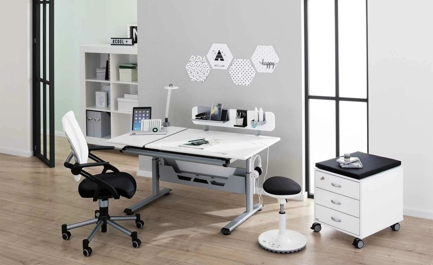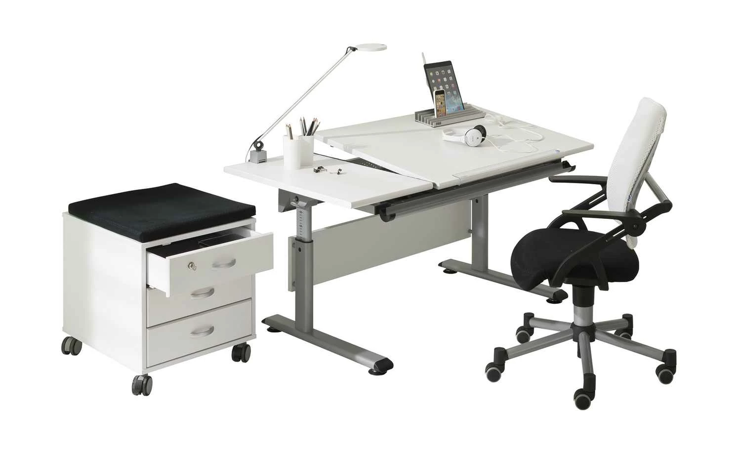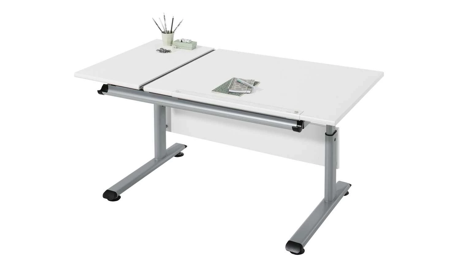 Der Schreibtisch Marco 2 eignet sich gleichermaßen für Schulaufgaben, zum Malen und Basteln. Das Wichtigste ist aber die manuelle Höhenverstellung, durch die der Tisch an die Größe des Kindes bzw. des Schülers angepasst werden kann. So „wächst“ Marco 2 praktischerweise mit seinem Nutzer mit. Der Tisch hat eine große und eine kleine Tischplatte, die wahlweise links oder rechts angebracht werden können. Die große Platte lässt sich bis zu einem Winkel von 19 Grad kippen, wodurch das Schreiben und Malen erleichtert werden. Das Gestell besteht aus Metall und ist in einem Silberton gehalten, während die Tischplatte melaminbeschichtet ist. Das macht sie besonders widerstandsfähig und pflegeleicht.