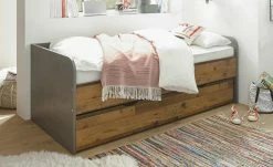 - Ausführung: mit Unterschiebebett, seitlichem Regal mit 3 Fächern und seitlichem Bettkasten mit Klappe