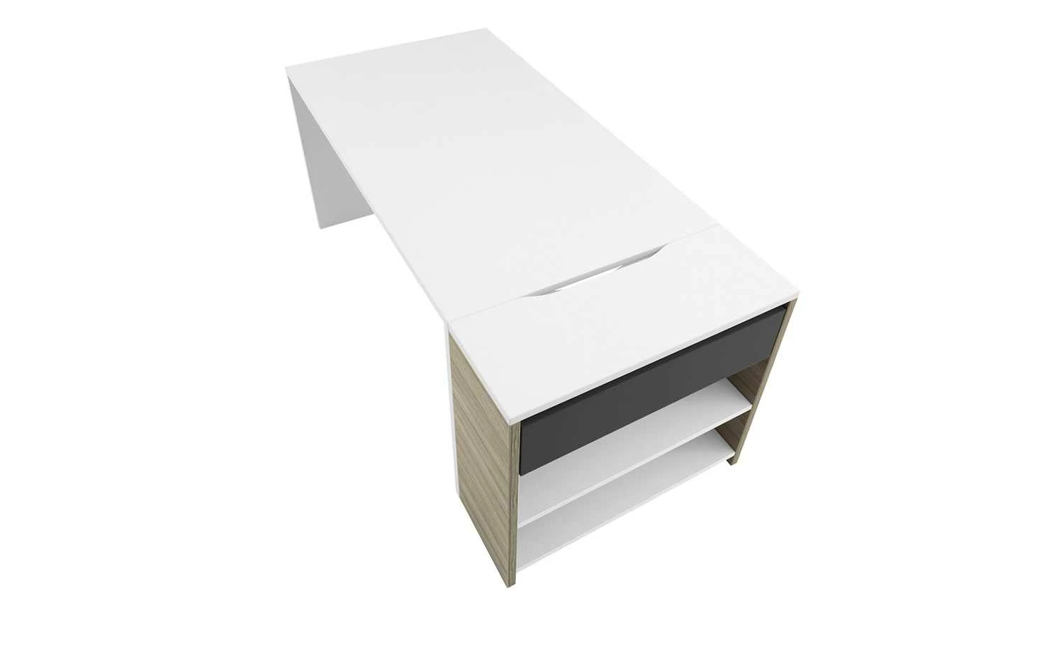 Das Regal Holly wird seitlich an den Schreibtisch angebracht. Es hat zwei offenes Fächer – sowie ein weiteres Fach, das durch eine Klappe geschlossen wird. Auf der Rückseite befindet sich eine Aussparung, durch die Sie Kabel führen können.