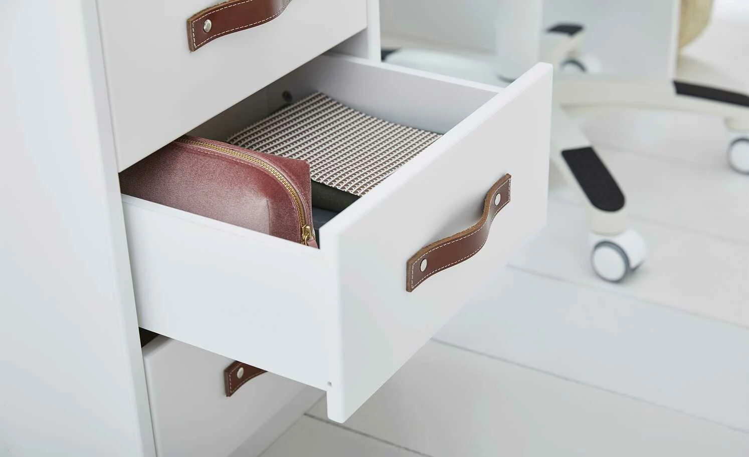 - Mehr zum Material: Korpus und Front: MDF, Weiß lackiert, Griffe: Ledergriffe