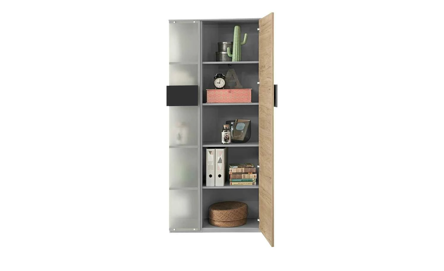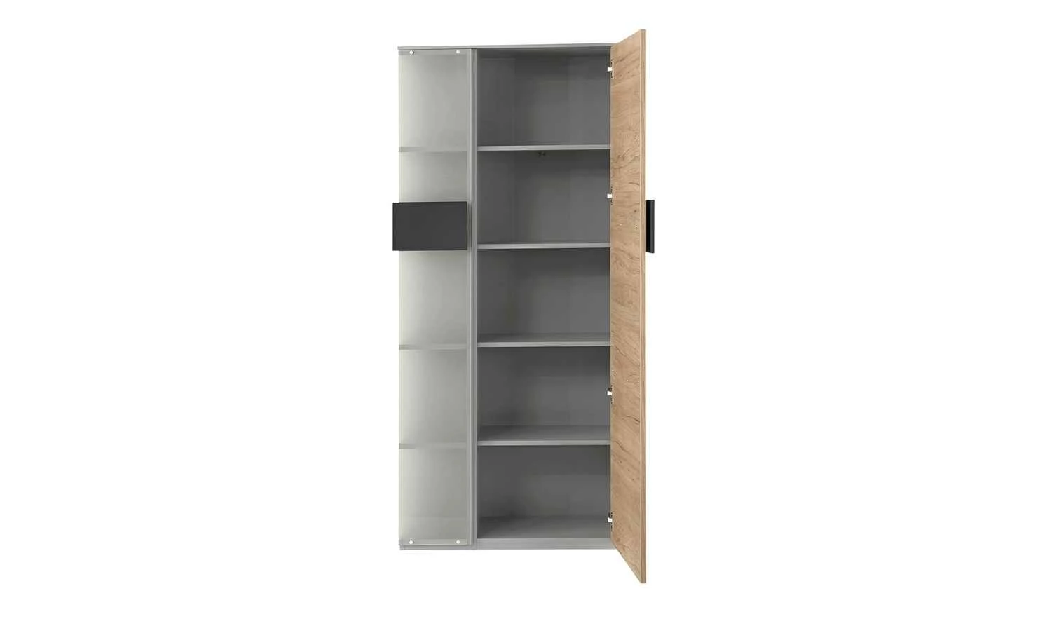 - Mehr zu Ausstattung / Funktion: Drehtür mit Metall-Topfbandscharnieren mit 110 Grad Öffnungswinkel, 3 Böden hinter der Glasfront, Regal mit Geheimfach, Front: 19 mm stark mit ABS-Kante, Korpus: 16 mm stark mit Dekorkante, 4 Böden hinter der Tür
