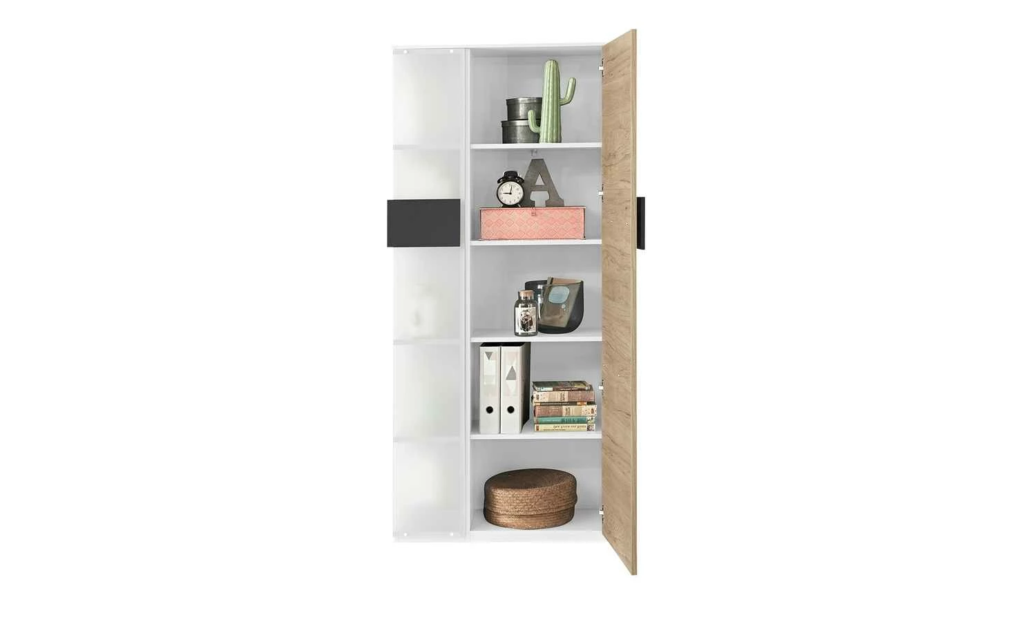 - Mehr zu Ausstattung / Funktion: Drehtür mit Metall-Topfbandscharnieren mit 110 Grad Öffnungswinkel, 3 Böden hinter der Glasfront, Regal mit Geheimfach, Front: 19 mm stark mit ABS-Kante, Korpus: 16 mm stark mit Dekorkante, 4 Böden hinter der Tür