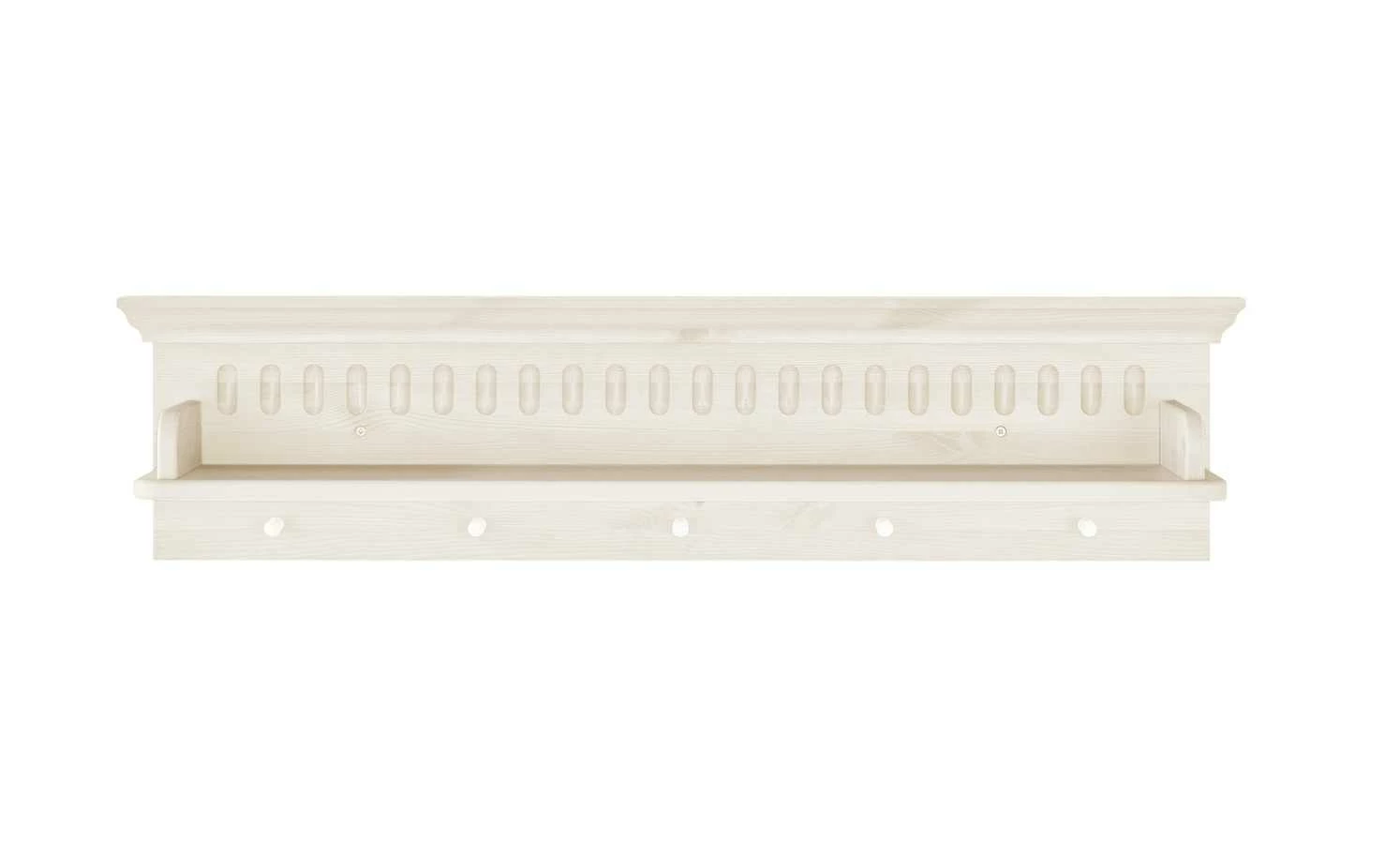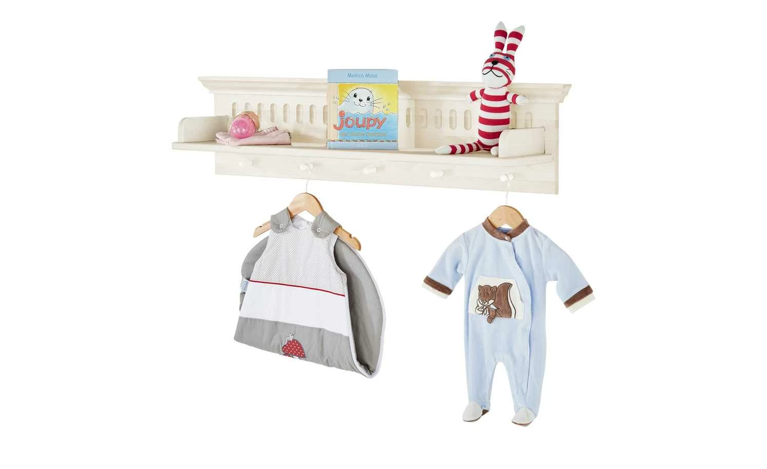 Im Babyzimmer macht sich das Wandboard Bornholm gut – zum Beispiel oberhalb der Wickelkommode. Das Board selbst bietet viel Stellfläche für Babypflegeartikel. Strampler und Mützchen können Sie an die Kleiderhaken hängen. Gleich fünf sind vorhanden. Bornholm ist komplett aus massiver Kiefer gefertigt und weiß gewachst.